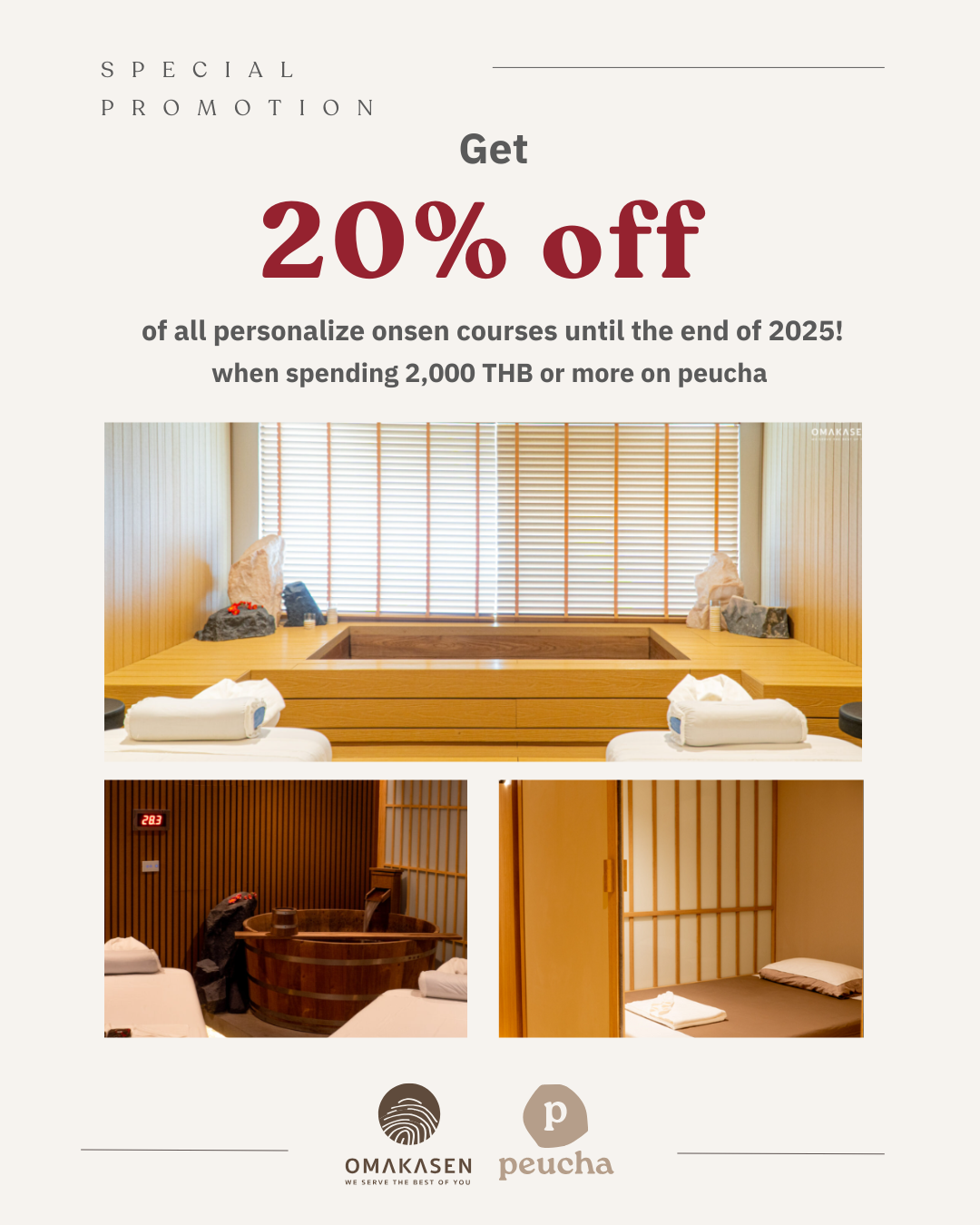 - receive a 20% discount code for Personalize Onsen Course at Omakasen Onsen and spa